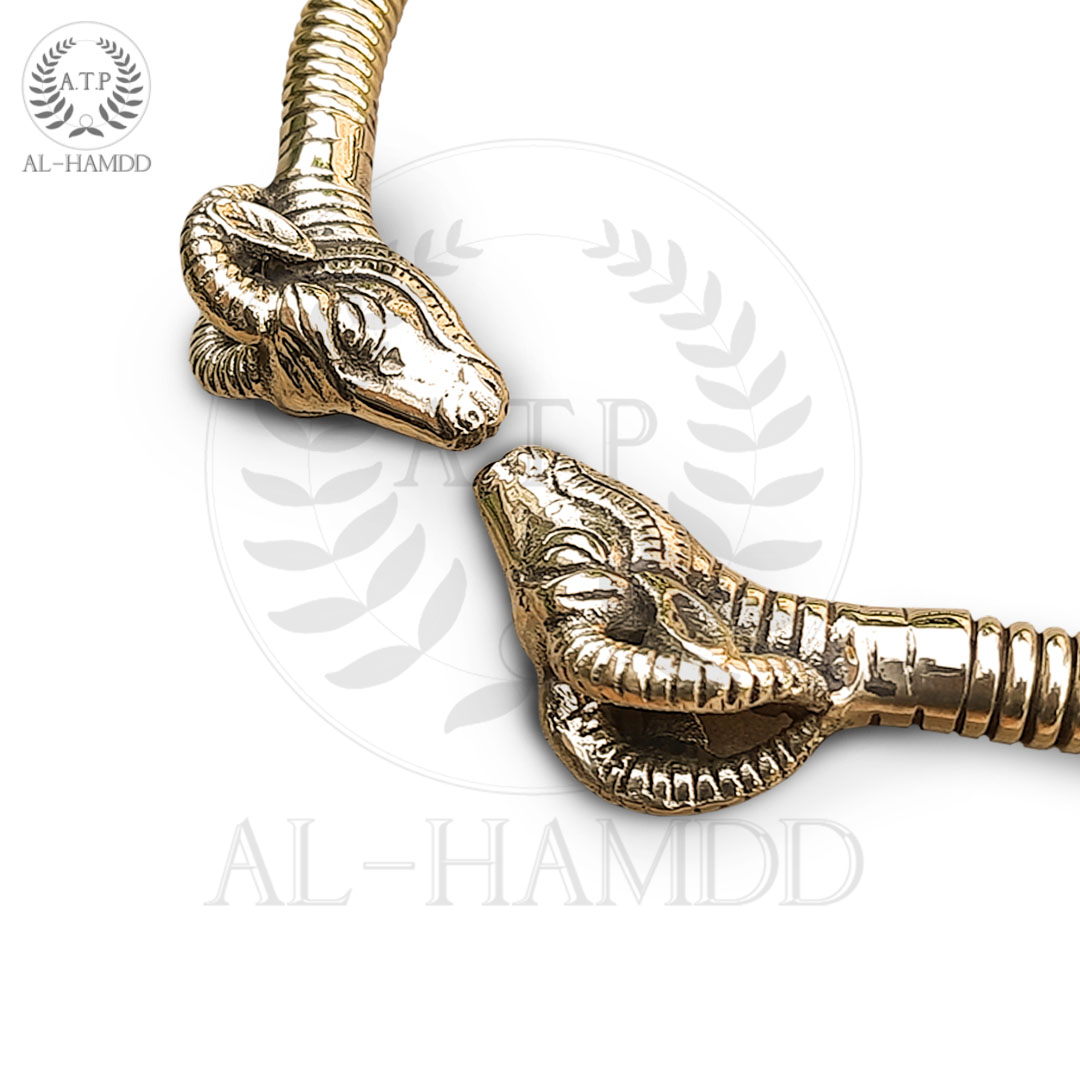 Torc with Ram’s heads is a piece of historical jewellery that was used during the Celtic period. The replica is made of brass metal wires with solid ram’s heads attached to the terminals. A 2mm wire is coiled (to form a spring) around a 4mm brass wire core, and the terminals are welded in place. The final Torc with Ram’s heads is given a polished finish.